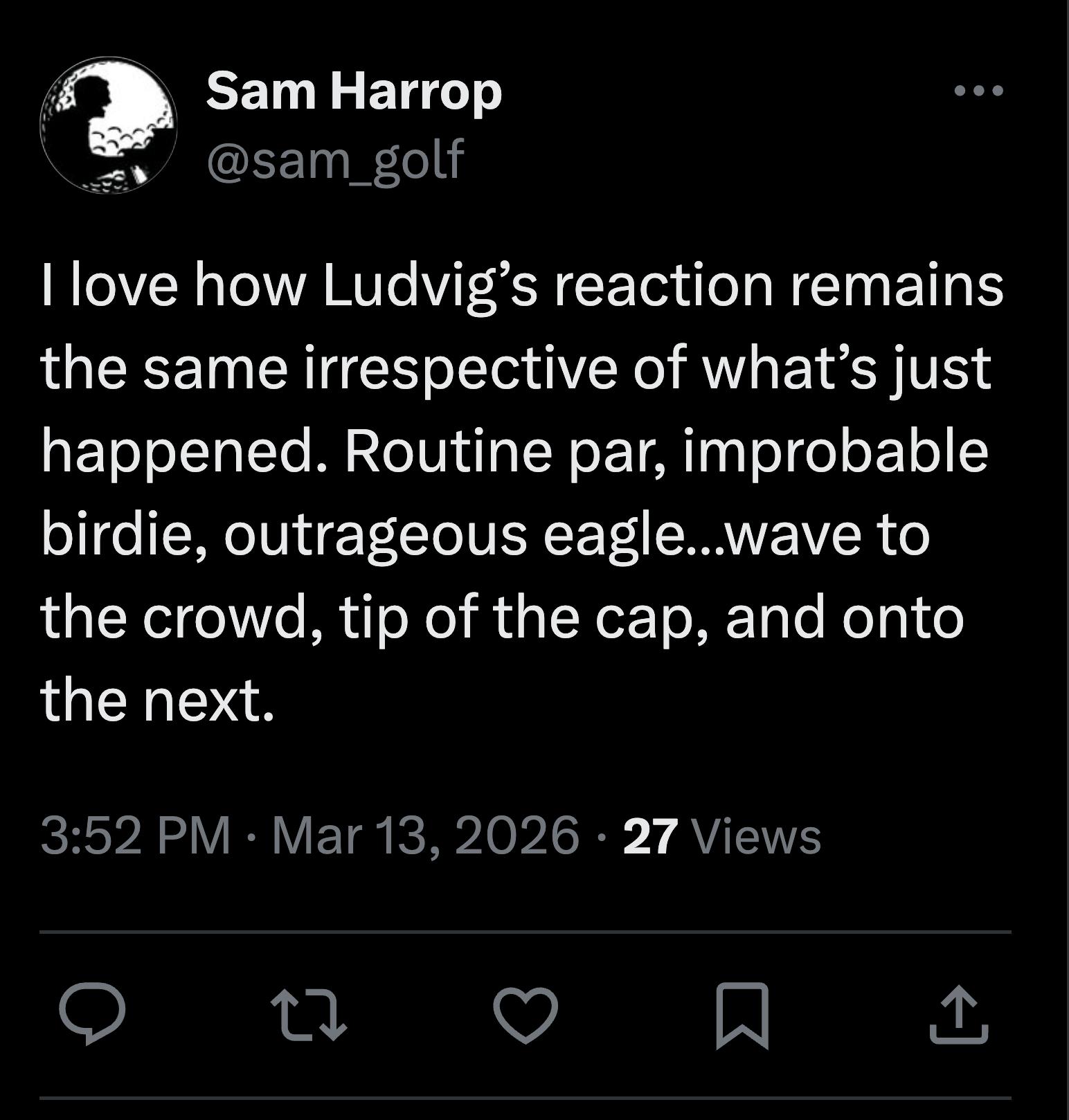 Making this complex thing look so basic and languid. Making the bottomless well of golf intricacy look like you’re simply dipping a ladle and taking a drink. It feels impossible that anyone could ever waste less effort being great at the game than Ludvig does.